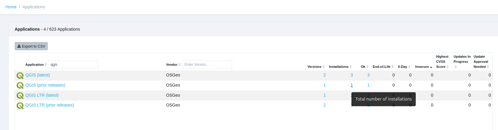 From the Applications page, click on the result under the Installations column to view hosts with QGIS (prior releases) installed and use the