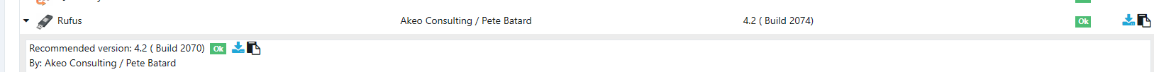 Rufus 4.2 (Build 2074) is reported as older than 4.2 (Build 2070) and not the recommended version.