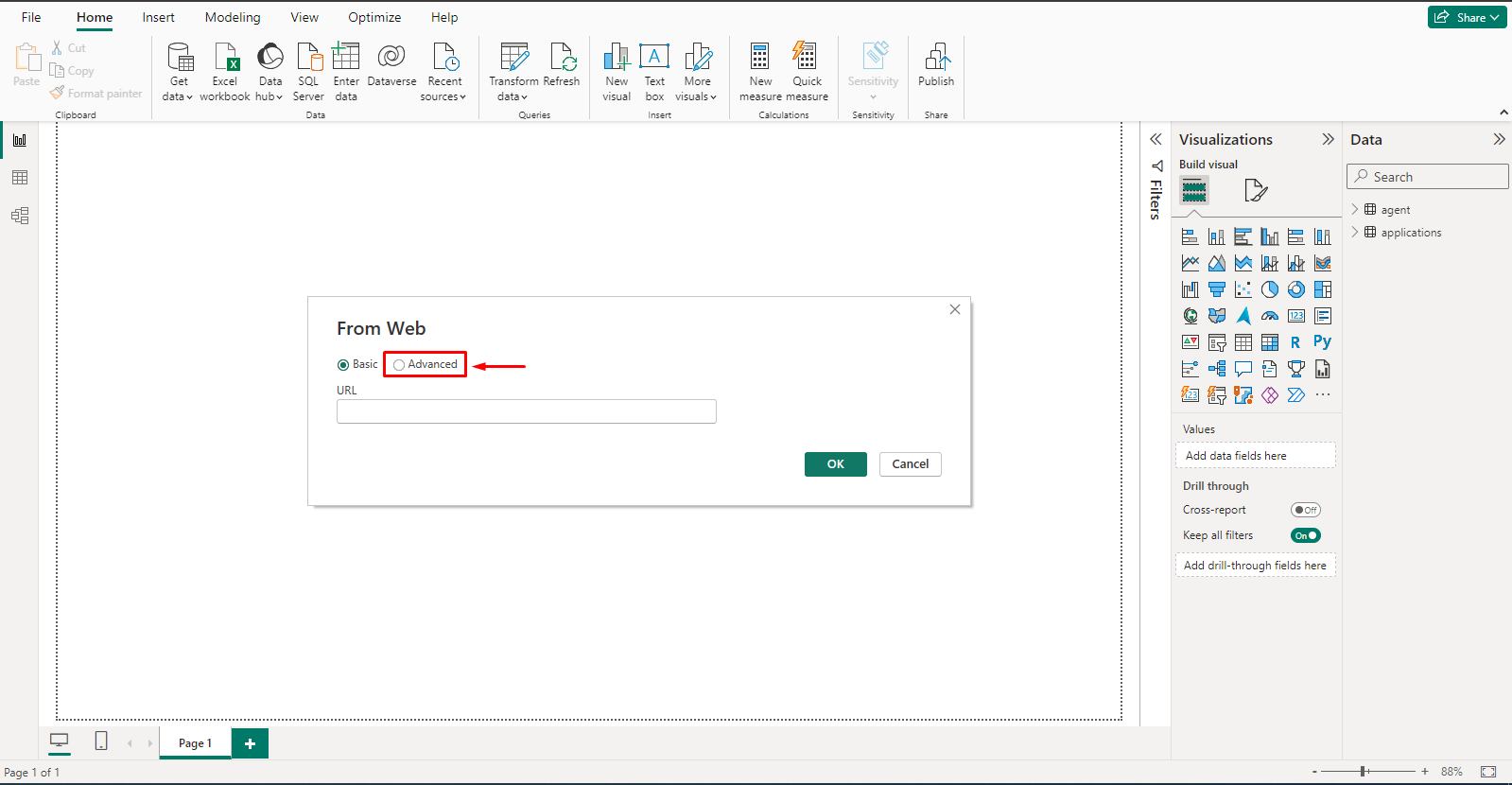 In the Microsoft Power BI window, click on Get Data -> Web.